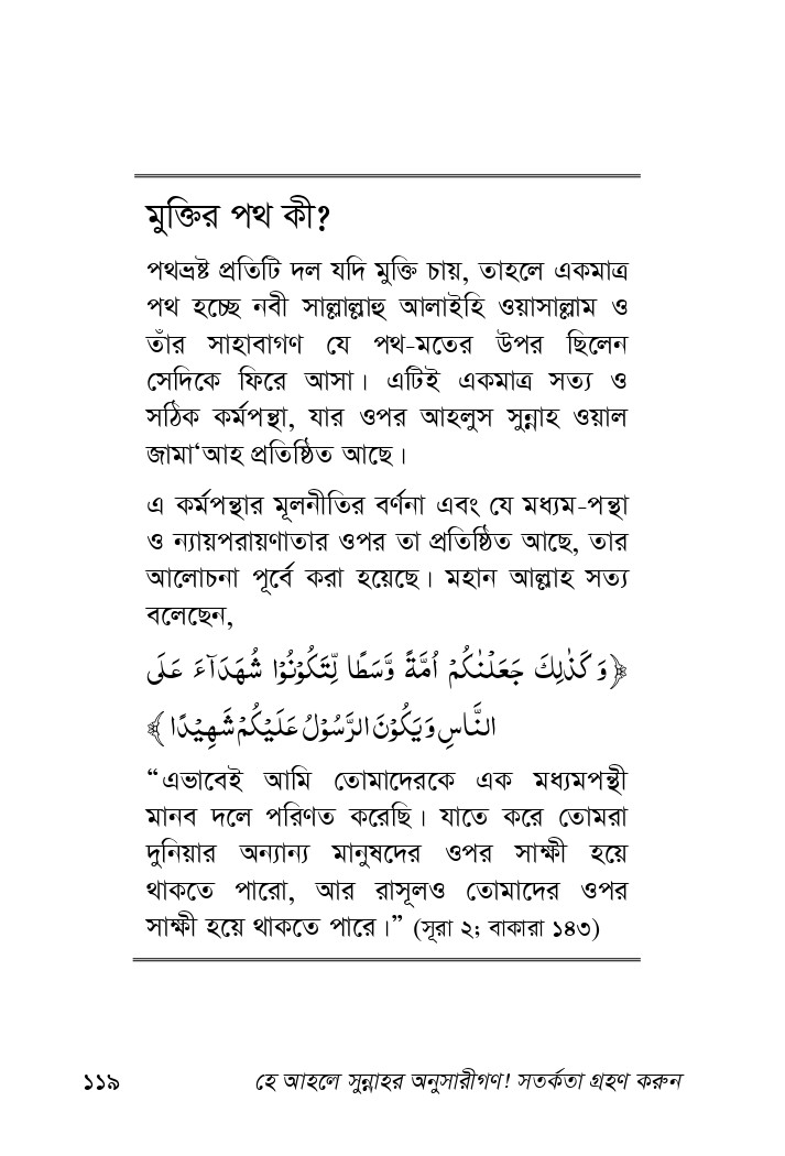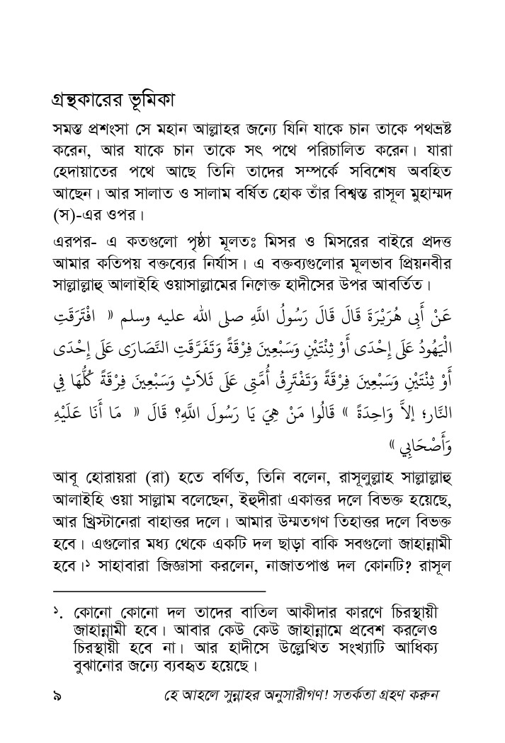 “আমার উম্মত ৭৩ দলে বিভক্ত হবে। একটি ব্যতিত ৭২ দলের অনুসারীগণ জাহান্নামী হবে।” রাসূল (স)-এর এই বিখ্যাত হাদীসের তাৎপর্য নিয়ে নানাভাবে পর্যালোচনা হয়। তবে অনেকেই নিজেদের তৎপরতাকে জান্নাতী দলের বৈশিষ্টমণ্ডিত মনে করে তৃপ্তিবোধ করেন। অত্র গ্রন্থে লেখক এ বিষয়ের চমকপ্রদ বিশ্লেষণ করেছেন, কুরআন-সুন্নাহর আলোকে। সদা সঙ্কিত মুসলিম সমাজ নানা রকম আক্রমনে দিকভ্রান্ত। গ্রন্থটি পাঠ করলে স্পষ্টভাবেই গোমরাহ দলগুলোর মৌলিক পরিচয় জানতে পারবেন। আমরা আশা করি, সম্মানিত পাঠকবর্গ বইটির প্রয়োজনীয়তা সহজেই অনুধাবন করতে পারবেন।