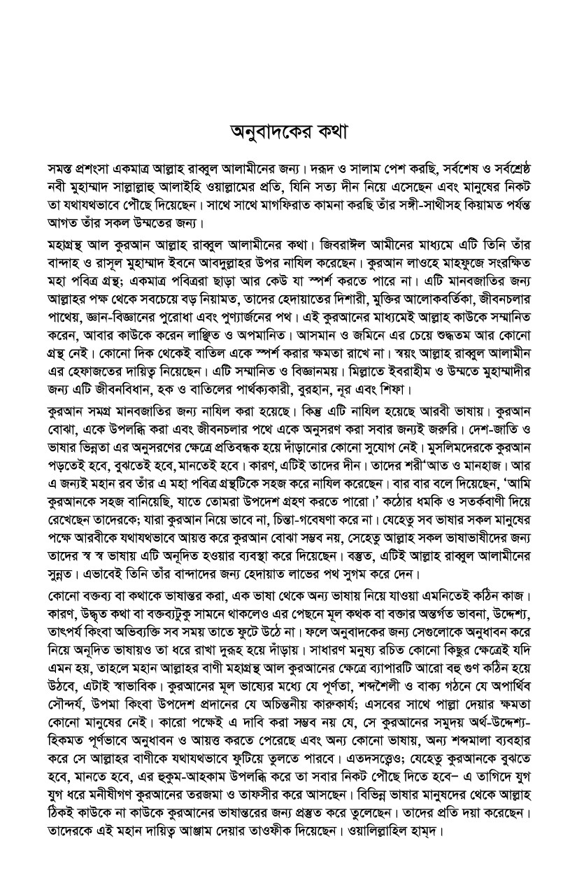 কোনো বক্তব্য বা কথাকে ভাষান্তর করা, এক ভাষা থেকে অন্য ভাষায় নিয়ে যাওয়া এমনিতেই কঠিন কাজ। কারণ, উদ্ধৃত কথা বা বক্তব্যটুকু সামনে থাকলেও এর পেছনে মূল কথক বা বক্তার অন্তর্গত ভাবনা, উদ্দেশ্য, তাৎপর্য কিংবা অভিব্যক্তি সব সময় তাতে ফুটে উঠে না। ফলে অনুবাদকের জন্য সেগুলোকে অনুধাবন করে নিয়ে অনূদিত ভাষায়ও তা ধরে রাখা দুরূহ হয়ে দাঁড়ায়। সাধারণ মনুষ্য রচিত কোনো কিছুর ক্ষেত্রেই যদি এমন হয়, তাহলে মহান আল্লাহর বাণী মহাগ্রন্থ আল কুরআনের ক্ষেত্রে ব্যাপারটি আরো বহু গুণ কঠিন হয়ে উঠবে, এটাই স্বাভাবিক। কুরআনের মূল ভাষ্যের মধ্যে যে পূর্ণতা, শব্দশৈলী ও বাক্য গঠনে যে অপার্থিব সৌন্দর্য, উপমা কিংবা উপদেশ প্রদানের যে অচিন্তনীয় কারুকার্য; এসবের সাথে পাল্লা দেয়ার ক্ষমতা কোনো মানুষের নেই। কারো পক্ষেই এ দাবি করা সম্ভব নয় যে, সে কুরআনের সমুদয় অর্থ-উদ্দেশ্য-হিকমত পূর্ণভাবে অনুধাবন ও আয়ত্ত করতে পেরেছে এবং অন্য কোনো ভাষায়, অন্য শব্দমালা ব্যবহার করে সে আল্লাহর বাণীকে যথাযথভাবে ফুটিয়ে তুলতে পারবে। এতদসত্তে¡ও; যেহেতু কুরআনকে বুঝতে হবে, মানতে হবে, এর হুকুম-আহকাম উপলব্ধি করে তা সবার নিকট পৌঁছে দিতে হব। এ তাগিদে যুগ যুগ ধরে মনীষীগণ কুরআনের তরজমা ও তাফসীর করে আসছেন। বিভিন্ন ভাষার মানুষদের থেকে আল্লাহ ঠিকই কাউকে না কাউকে কুরআনের ভাষান্তরের জন্য প্রস্তুত করে তুলেছেন। তাদের প্রতি দয়া করেছেন। তাদেরকে এই মহান দায়িত্ব আঞ্জাম দেয়ার তাওফীক দিয়েছেন। ওয়ালিল্লাহিল হাম্দ।