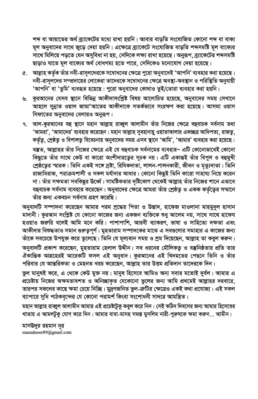৫. আল্লাহ কর্তৃক তাঁর নবী-রাসূলদেরকে সম্বোধনের ক্ষেত্রে পুরো অনুবাদেই ‘আপনি’ ব্যবহার করা হয়েছে। নবী-রাসূলদের সম্প্রদায়ের লোকেরা তাদেরকে সম্বোধনের ক্ষেত্রে অবস্থা-অবস্থান ও পরিস্থিতি অনুযায়ী ‘আপনি’ বা ‘তুমি’ ব্যবহৃত হয়েছে। পুরো অনুবাদের কোথাও তুই/তোরা ব্যবহার করা হয়নি।